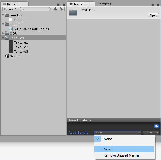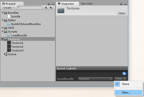 In this example, the Textures folder has the label textures and the new script BuildiOSAssetBundles.cs is created in the Editor folder.