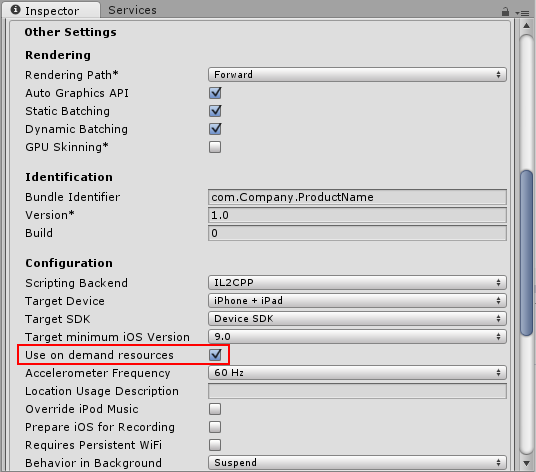 如果尚未选中相关选项,请单击 iOS ,然后单击 Switch Platform 按钮。接下来,单击 Player Settings 按钮。在 Inspector 窗口中,打开 Other Settings ,导航到 Configuration 部分,然后启用 Use on demand resources 复选框。