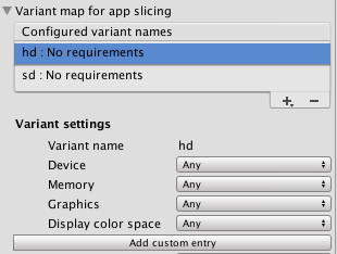 You can now see and modify variants in Player Settings > Other Settings > Configuration in a Variant map for app slicing drop-down menu. The Variant map for app slicing menu is visible only if Use on demand resources is enabled in Player Settings.