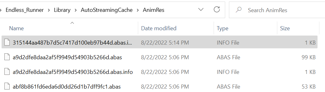 所有 AutoStreaming 生成的资源文件都以 .abas 为后缀,并且存放在 Library\AutoStreamingCache 目录下。在 Window -> AutoStreaming -> Cfg&Publish 页面右侧,提供了对所有 AutoStreaming 资源文件大小的统计信息。