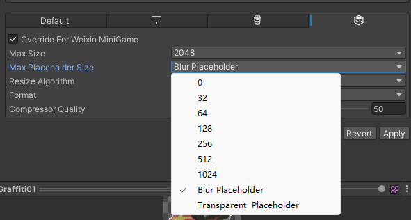 | Generate Placeholders | 为所有勾选的 texture 生成一张低分辨率的替用贴图;也可以选择生成透明或者模糊形式; |