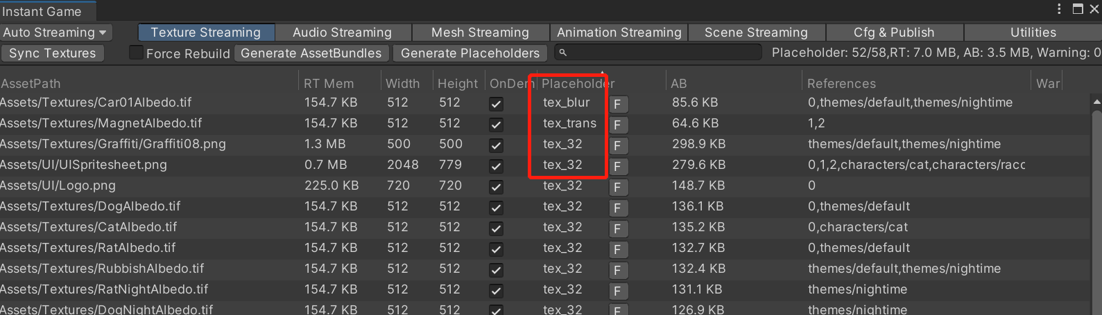 Placeholder 默认类型为缩略图,大小为 32x32 。 可以在 AutoStreaming -> Texture Streaming 页面查看每个 texture 当前的 placeholder 类型。 可在原图 Inspector 窗口修改,其中缩略图类型支持从 32 - 1024 的大小调整。
