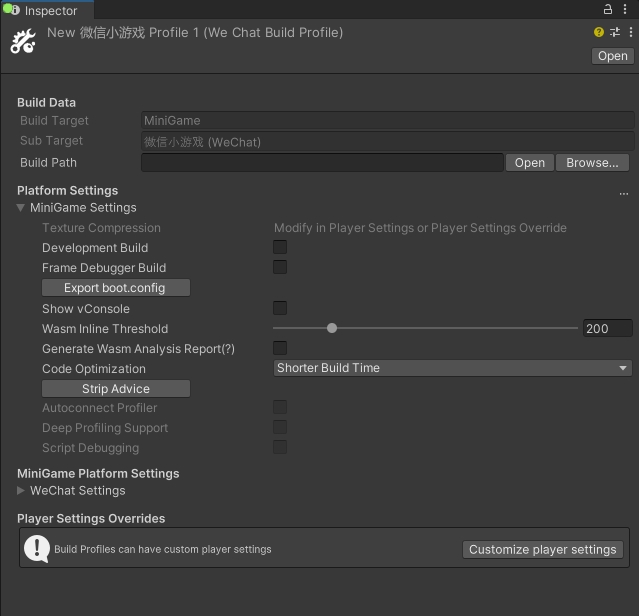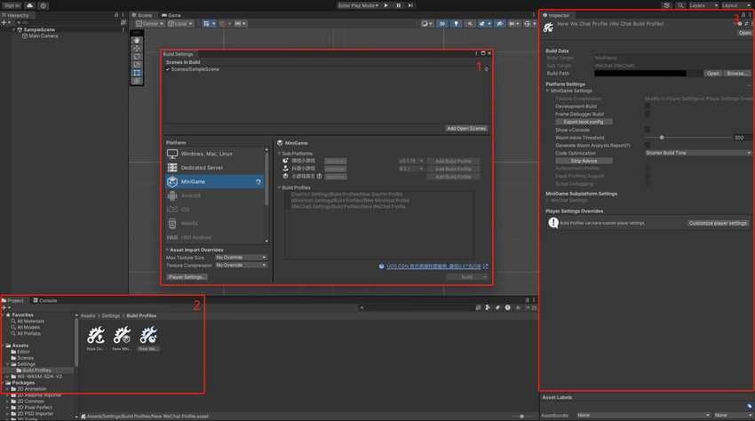 切换后,您可以开始配置小游戏的 Build Profile,其核心功能由以下三个界面组成: