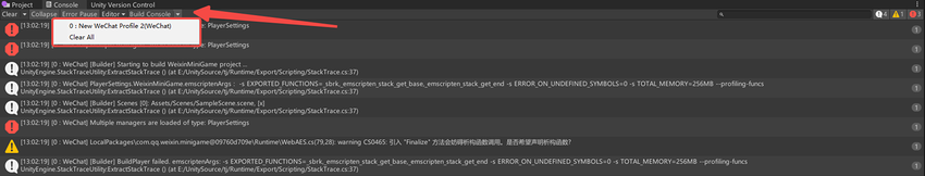 打包结束后,Console 界面将出现 Build Console 的按钮。点击将显示所有打包的信息,您可以选择筛选某一个 Profile 的打包信息进行查看,或清除所有打包信息。