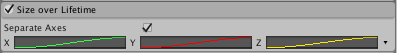 您可以指定粒子的宽度、高度和深度如何在生命周期内分别变化。在 Size over Lifetime 模块中,选中 Separate Axes 复选框,然后更改 X(宽度)、Y(高度)和 Z(深度)。请注意,Z 仅用于网格粒子。
