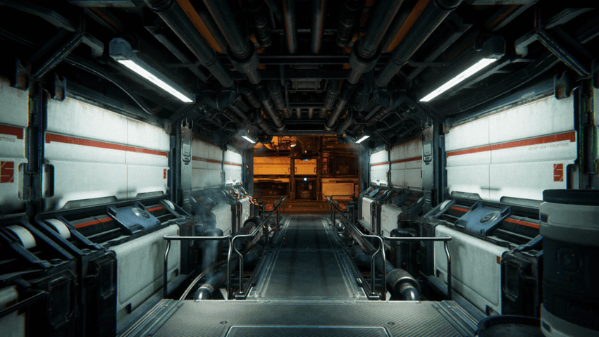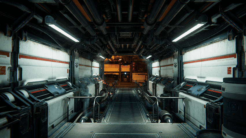 The Spaceship Demo Project rendered with a screen percentage of 50, but using DLSS. This image is less blurry than the previous image, especially around the spark visual effect.
