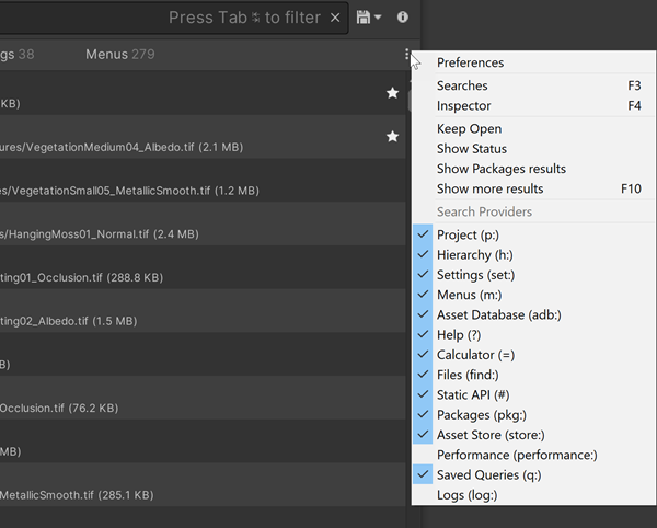 For example, p: is the search token for the Asset Search Provider. When you enter p:Player in the search field, Search searches for Assets that match the term “Player” (for example, assets with “Player” in their names).