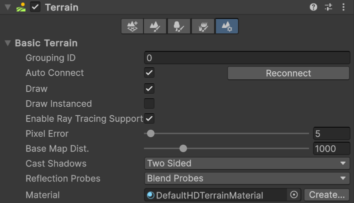 在极少情况下,如果更改 Grouping ID,或者为一个或多个地形瓦片禁用 Auto connect,则可能会丢失瓦片之间的连接。要重新创建瓦片之间的连接,请单击 Reconnect 按钮。仅当两个相邻的瓦片具有相同的 Grouping ID 以及两个瓦片都启用了 Auto Connect 的情况下,Reconnect 才会连接这两个瓦片。
