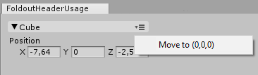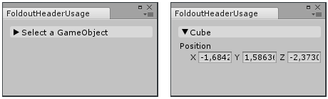 public class FoldoutHeaderUsage : EditorWindow { bool showPosition = true; string status = "Select a GameObject";