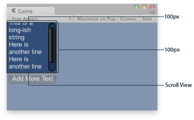 // Now we add a button outside the scrollview - this will be shown below // the scrolling area. if (GUILayout.Button("Add More Text")) longString += "\nHere is another line"; } }