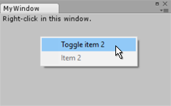 // This example shows how to create a context menu inside a custom EditorWindow, // where the first menu item toggles whether the second menu item is enabled // or disabled.