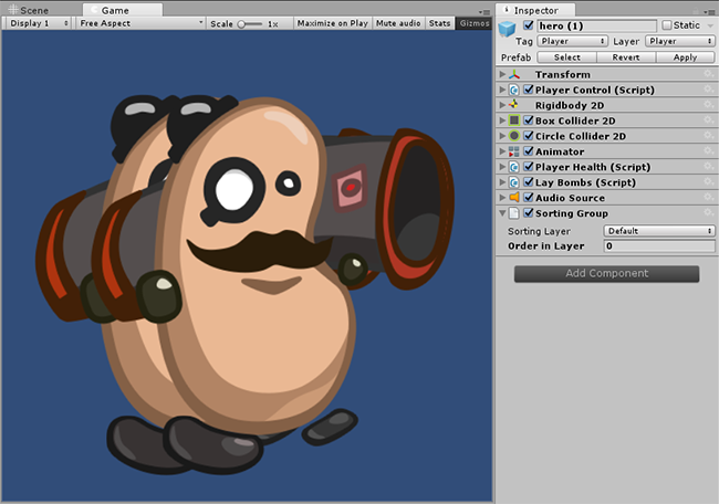 A common use case for having a SortingGroup is to create complex 2D characters that are made up of multiple SpriteRenderers. When several clones of such a character overlap, their individual body parts might not be sorted properly resulting in a visual glitch where the the body parts interleave. For example, the hands of two characters might be sorted in front of their bodies, where you would expect one entire character to be drawn in front of the other character. The SortingGroup component solves this by ensuring the entire branch of the character are sorted and rendered together.