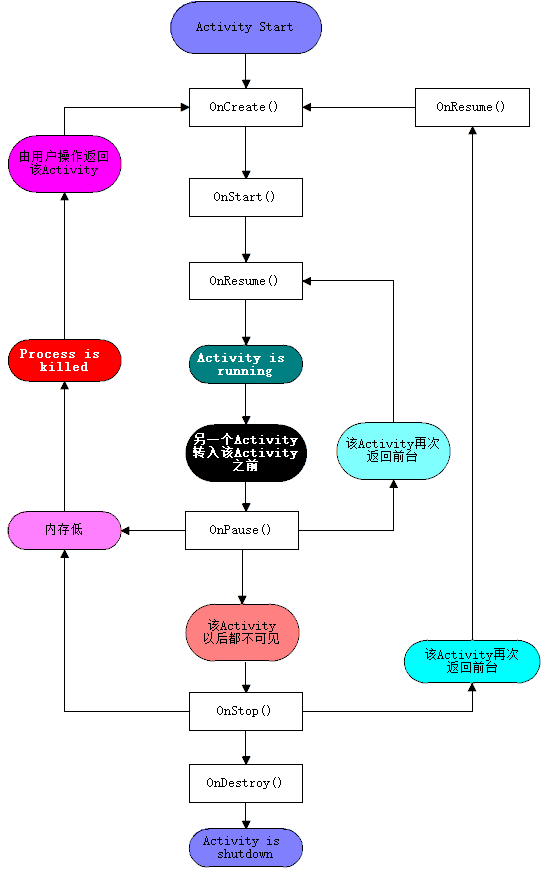 | 销毁状态 | 该Activity结束,或Activity所在的Dalvik进程被结束 |