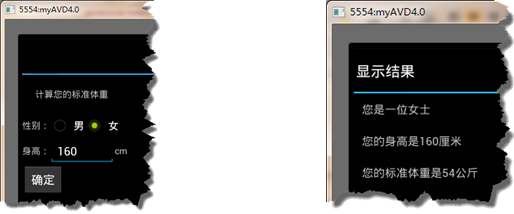 Intent和Bundle来实现,与在两个Acitivity之间交换数据不同的是,此处需要使用startActivityForResult()方法来启动另一个Activity。实例1:实现根据身高计算标准体重