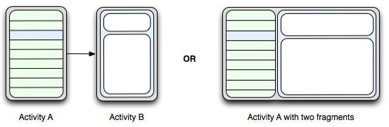 Fragment比较强大的功能之一就是可以合并两个Activity,从而让这两个Activity在一个屏幕上显示,例如下图所示(参照Android官方文档),左边的两个图分别代表两个Activity,右边的这个图表示包括两个Fragment的Activity,其中第一个Fragment的内容是Activity A,第二个Fragment的内容是Activity B。